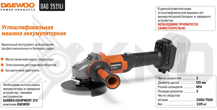 Только у нас угловая шлифмашина аккумуляторная DAEWOO DAG 2521Li без АКБ и ЗУ по самой доступной цене! На все товары распространяется гарантия от производителя. Оперативная доставка в Тамбове. Оформите заказ сейчас и специалисты интернет-магазина свяжутся с Вами в течение нескольких минут.Документация